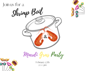 Shrimp Boil & Mardi Gras Party Calendar Add to Calendar Add to Timely Calendar Add to Google Add to Outlook Add to Apple Calendar Add to other calendar Export to XML When: February 27, 2022 @ 2:00 pm 2022-02-27T14:00:00-01:00 2022-02-27T14:15:00-01:00 By Katie| 2022-02-21T19:01:02-05:00 August 3rd, 2017|Comments Off on Shrimp Boil & Mardi Gras Party Share This Story, Choose Your Platform! FacebookTwitterLinkedinRedditTumblrGoogle+PinterestVkEmail About the Author: Katie