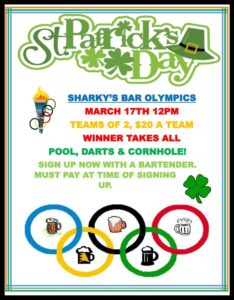 By | 2019-03-11T20:49:09-04:00 August 3rd, 2017|Comments Off on St. Patrick’s Day Party and Bar Olympics!